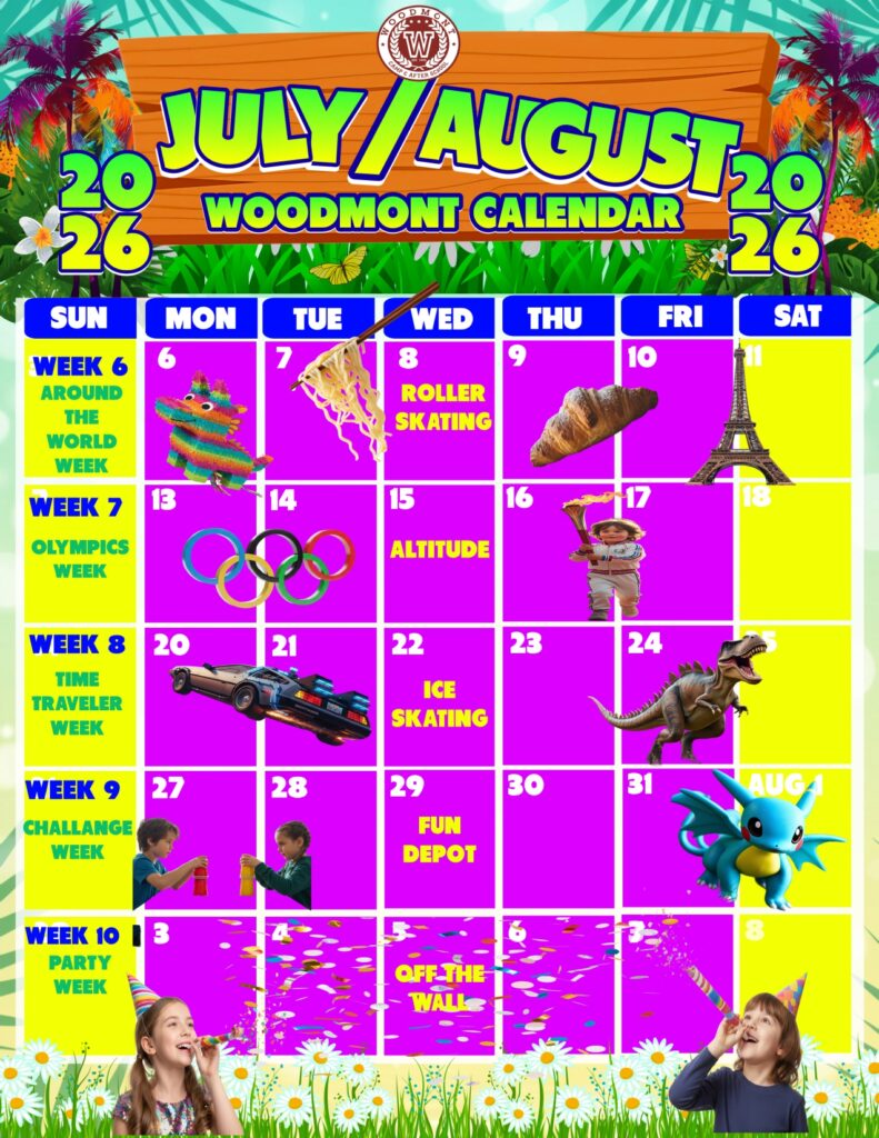 The Woodmont Summer Camp calendar gives families a complete look at our exciting 2026 summer schedule, including weekly themes, field trips, special events, and daily activities from June through August.