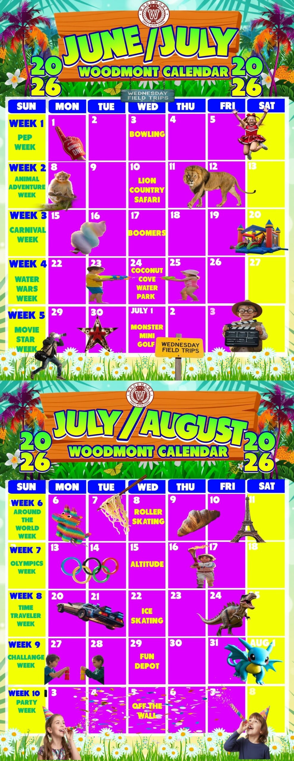 The Woodmont Summer Camp calendar gives families a complete look at our exciting 2026 summer schedule, including weekly themes, field trips, special events, and daily activities from June through August.